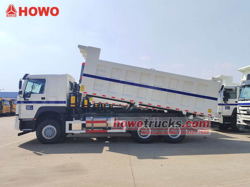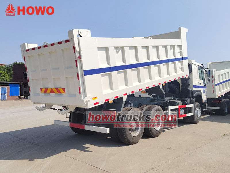 HOWO 6x4-dumpern är modifierad baserat på HOWO HW76-chassit, med en hjulbas på 3200+1400 mm, utrustad med 380 hk WP10.380E22 dieselmotor, HW19710-växellåda, 10-växlar framåt, 2-växlar bakåt och en tipplåda av kolstål med en sidtjocklek på 8 mm, en bottentjocklek på 10 mm, 5200x2300x1400 mm, lyft framtill, stabil lyftning, ren och snabb lossning, bakdörrarna kan öppnas och fordonet styrs av styrventilen på förarsidan, som är lätt att manövrera.