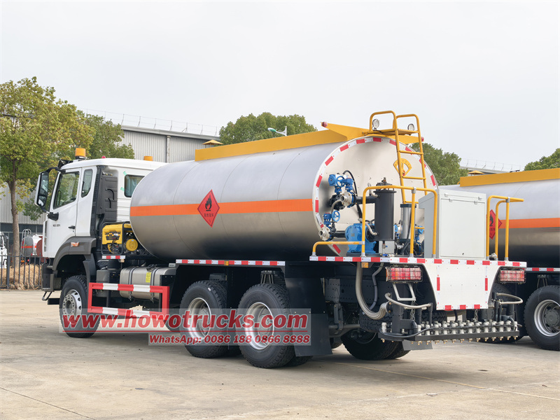 Sinotruk NX 6X4 asfaltfördelarlastbilen har en hjulbas på 3800+1350 mm, är utrustad med en Sinotruk WD615.47-motor, HW19710-växellåda, en 15 kubikmeter asfalttank, RCB38/0.6-80F intelligent asfaltpump, Hebei termisk oljepump, italiensk G20-brännare och Lutian pneumatisk motor. Den kan lasta modifierad asfalt, varmblandad asfalt, emulgerad asfalt och andra asfaltmedia.