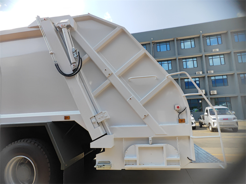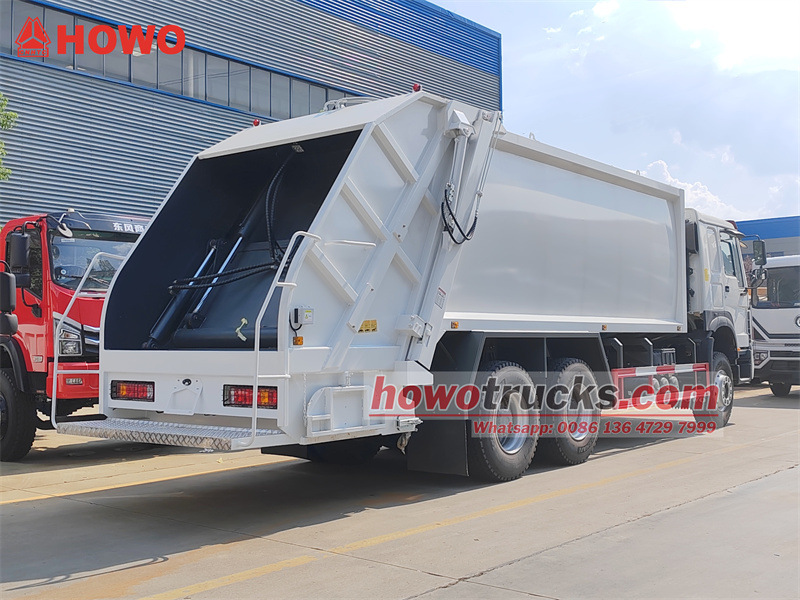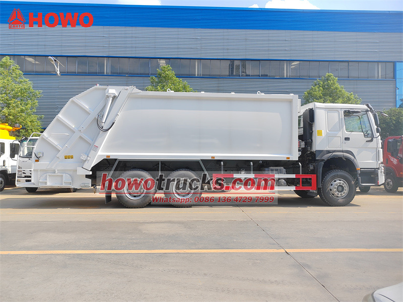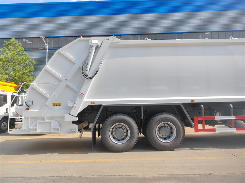 HOWO 6x4 22cbm baklastare sopbil är modifierad baserat på Sinotruk HW76 6x4-chassit. Med en hjulbas på 4600+1350 mm och en Weichai WP10.340E22-motor och en Sinotruk HW19710 10-växlad växellåda. Övre karossen är en 22cbm bågformad sopcontainer i kolstål med korrosions- och rostskyddsbehandling. Det finns ingen fällmekanism baktill, men det finns en liten plattform för att man ska kunna stå på och dumpa sopor. Det finns ledstänger på båda sidor om påfyllningslådan och fällbara pedaler på sidan. Lastning och lossning av sopor på detta fordon styrs av det elektroniska styrsystemet CAN-BUS, som specifikt styrs av den elektroniska styrboxen i hytten, den manuella hydrauliska manöverspaken på förarsidan och den elektroniska styrboxen för bakluckan.
