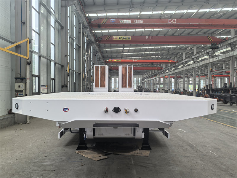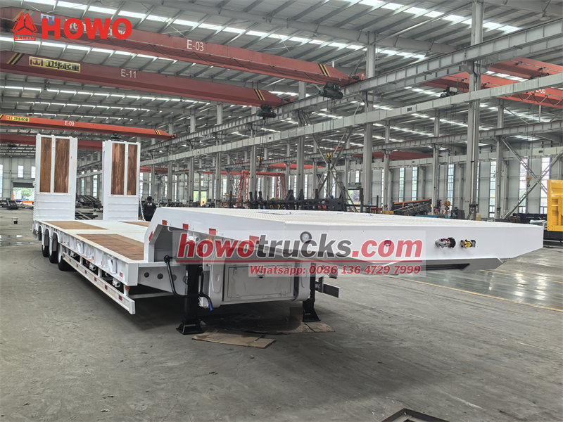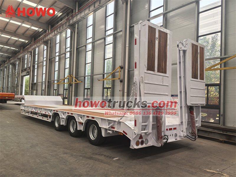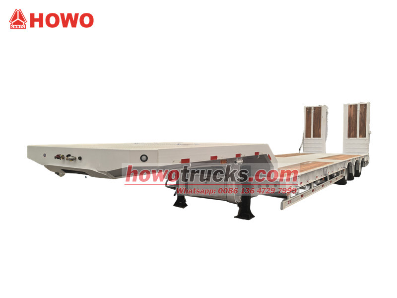 Den 45 ton tunga 3-axliga lågbäddsvagnen är ett fordon speciellt konstruerat för transport av stora maskiner och utrustning. Den är utrustad med en 50# JOST-vändskivekoppling och ett luftfjädringssystem med lyftanordning fram, utrustad med tre 13-tons självstyrande axlar. Släpvagnen är utrustad med ett WABCO EBS-bromssystem för att garantera körsäkerhet. De specialdesignade hydrauliska ramperna och flaket är belagda med dedikerat trägolv, vilket ger utmärkt halkskydd. Jämfört med konventionella modeller minskar dess självstyrande axlar effektivt däckslitaget, medan luftfjädringens lyftfunktion förbättrar framkomligheten utan last. Trädäcket hjälper till att minimera friktionsmotståndet och förbättrar lastnings- och lossningseffektiviteten.