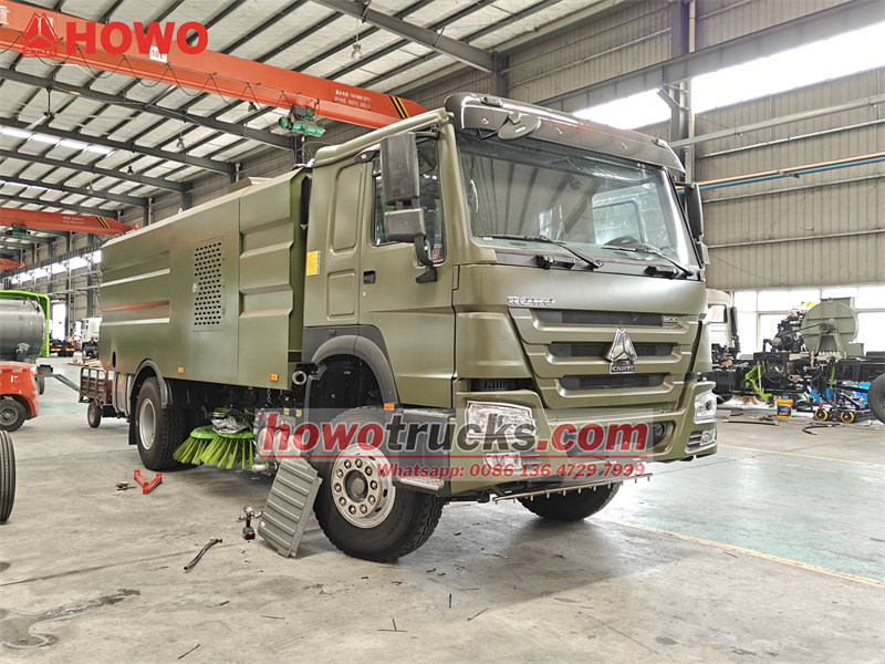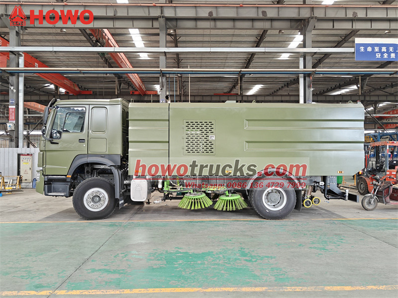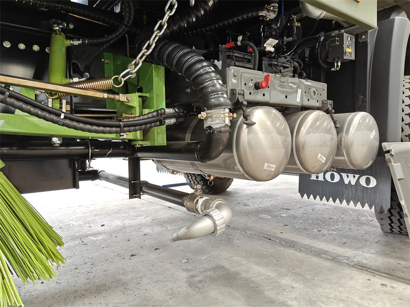 HOWO 12cbm sopmaskin är modifierad baserat på HOWO HW76 hyttchassi. Den har en hjulbas på 4600 mm och är utrustad med en Weichai WP10.300E22-motor, en Sinotruk HW19710-växellåda, en 4000L vattentank i kolstål, en 8000L inre och yttre soptunnor i kolstål i rostfritt stål och en Dongfeng Cummins B140 33 hjälpmotor. Fordonet är utrustat med fyra sopborstar och en sugkopp, en Weiye-fläkt, en tysk PINFL PF36 högtryckskolvpump (1150 r/min) och en Hangzhou Weilong 60/90 lågtrycksvattenpump (60m³/h). Det finns flera spolmunstycken framför hytten och ett sprutmunstycke framför sopborsten. Högtrycksvattenspolbredden är 2,5 m, sopborstens sopbredd är 3,5 m och den maximala sopkapaciteten är 60 000 m³/h. Sophastigheten är 3-20 km/h. Fordonet styrs av en elektronisk kontrollbox i hytten och en manöverbox vid sugarmen.