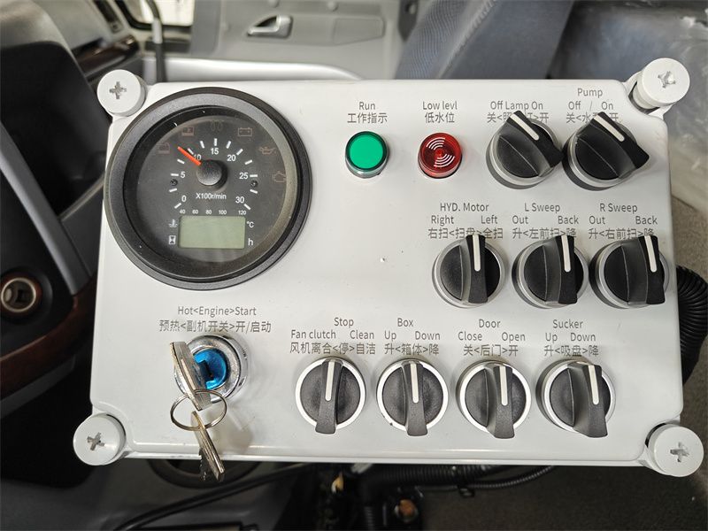 Det intelligenta elektroniska styrsystemet integrerar dubbla manöverboxar i hytten och nära sugkopparna, vilket möjliggör kontroll med en knapptryckning av funktioner som höjning och sänkning av borstar, tömning av tank och start och stopp av fläkten, vilket säkerställer bekväm och effektiv drift. Detta fordon använder en modulär integrerad design som integrerar elsystem, sopsystem, vattensystem och intelligent styrsystem för att uppnå effektiv, energibesparande och miljövänlig drift.