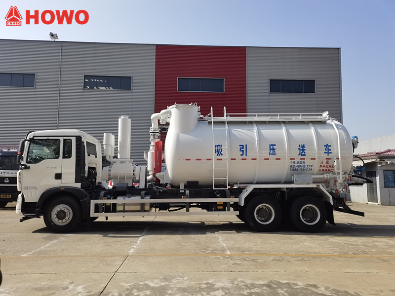 HOWO 6x4 15cbm sug- och trycktransportfordon är en modifierad version av HOWO TX-seriens 6x4-chassi. Den har en hjulbas på 5800 mm + 1350 mm och är utrustad med en Sinotruk MC07.31-60 310-hästkrafters motor och en HW13709XST 9-växlad växellåda. Den är utrustad med en lasttank (främst för lastning av pulver- och granulärt material, med en svetsad utvändig stege och en gångväg, lyftöglor, observationshål och en nivåmätare svetsad till tanktoppen), en suganordning, en utmatningsanordning, ett filtreringssystem (filterpåsar) och ett bakändesstyrsystem. Den är utrustad med en YIFENG SK-15 vakuumpump och en BDW-10/2 luftkompressor.