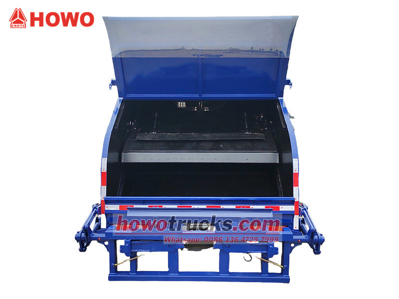 Sopkärlet är tillverkat av höghållfast väderbeständig stålplåt, med sidopaneler som är gjutna i ett stycke. Facket har utmärkt tätningsförmåga, vilket förhindrar avloppsläckage och luktspridning, vilket gör det miljövänligt och effektivt. Howo bakkomprimeringssopbil är lämplig för centraliserad insamling och transport av hushållsavfall i städer, bostadsområden, fabriker och andra platser. Den är enkel att använda och säker och pålitlig.