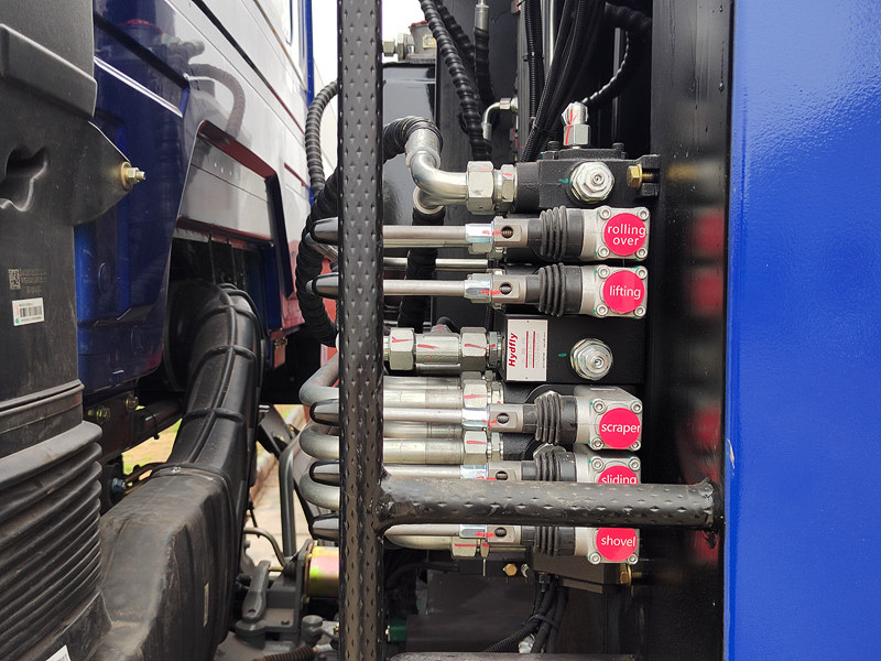 ♦När fordonet anländer till avfallsbehandlingsanläggningen reverserar hydraulsystemet sin funktion och trycker på påskjutaren för att mata ut det komprimerade avfallet från lastbilens flak.
