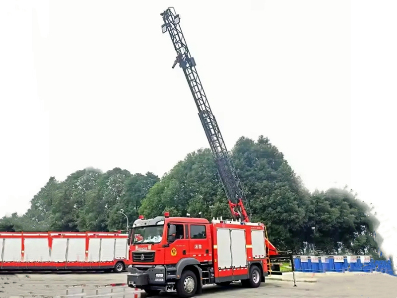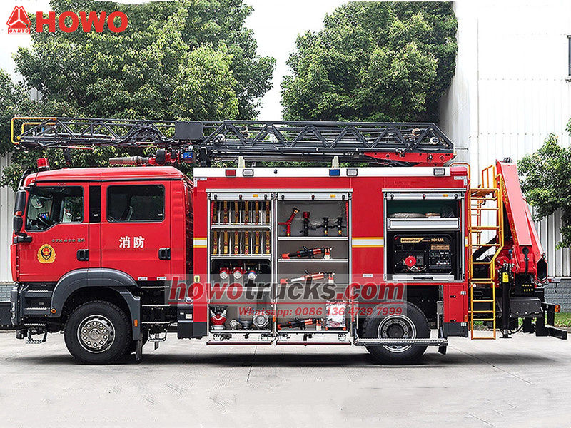 Howo-brandbilen med stege är ett specialfordon som är speciellt utformat för brandbekämpning och räddningsinsatser. Den använder Howo TX-seriens chassi, har en kraftfull 400 hk motor och utmärkt manövrerbarhet. Lastbilen har en klarröd brandbilslackering och är utrustad med flera förvaringsfack för olika räddningsutrustningar.