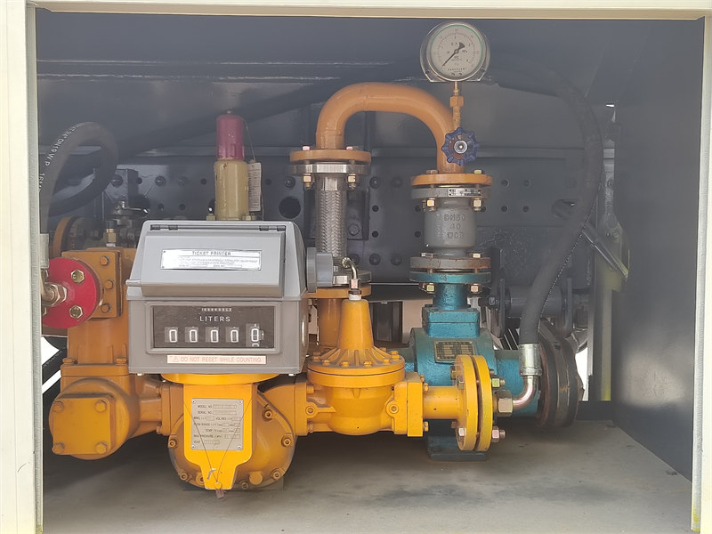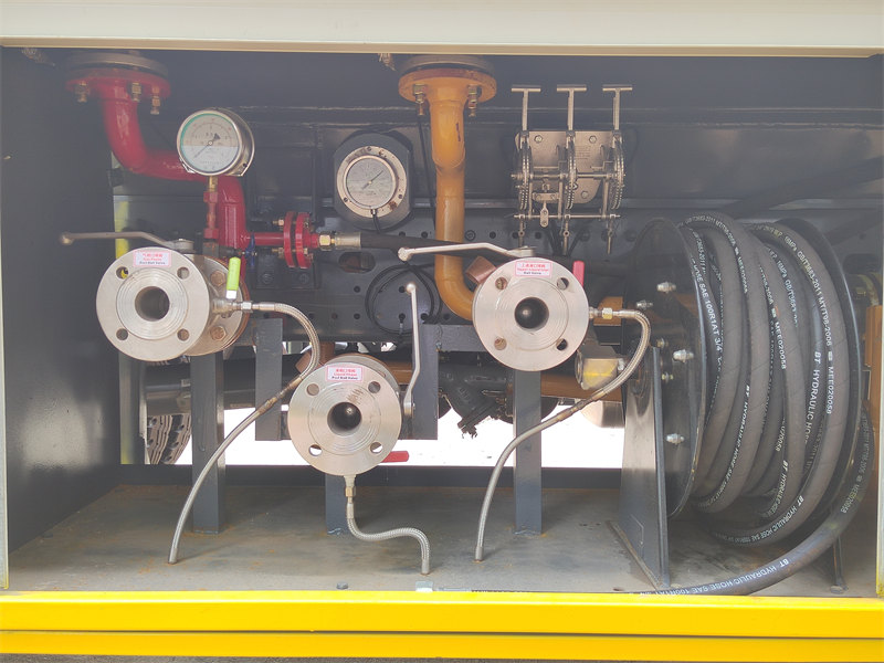 Tankbeslag: HOWO LPG-tankbil är utrustad med ett komplett påfyllningssystem inklusive pump, flödesmätare, slangvinda och nödavstängningsventil, tillsammans med viktiga säkerhetstillbehör som nivåmätare, termometer, tryckmätare och säkerhetsventil.