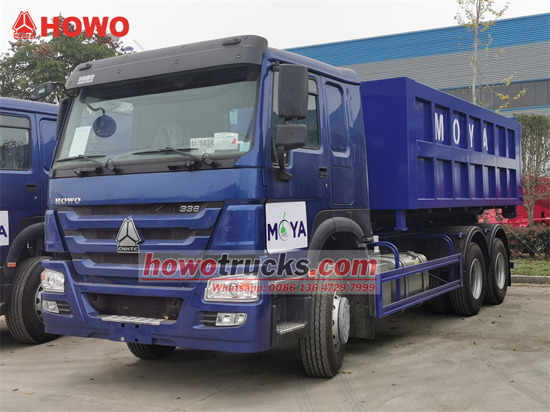 16000+16000HOWO 20tons rullarmssopbil kallas även howo kroklyftbil, Howo roll on roll off sopbil. CS TRUCKS kundanpassade tunga howo kroklyftbilar tillverkas baserade på HOWO 6x4 lastbilschassi, utrustade med WEICHAI dieselmotor med 340 hk, HW19710 manuell växellåda med 10 framåt och 2 bakåt, med effektiv effekt och låg bränsleförbrukning. HOWO-lastbilen har en stor arm med en fyrkantig struktur. Hela fordonet har ett vackert och elegant utseende. Den kan utrustas med flera soptunnor i ett fordon. Flera soptunnor kan placeras vid varje sopstation. Den har en självlossningsfunktion och är hydrauliskt manövrerad för enkel tömning. HOWO-lastbilen med lastväxlare är lämplig för alla miljöer. Användning. Låsanordningen som är utrustad på fordonet kan inte bara effektivt säkra soptunnan under transport, utan också underlätta lossning av sopor.