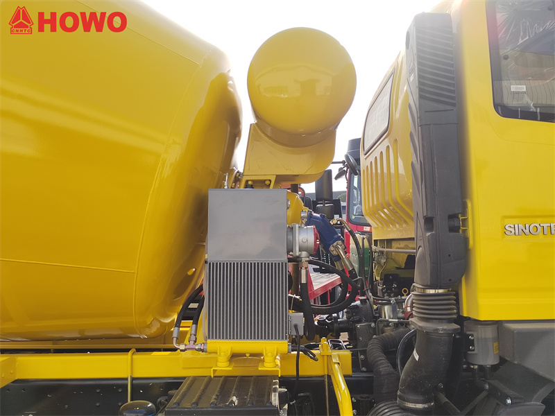 HOWO:s 5-kubikmeters betongblandare använder HOWO 2080-raders halvhytt, med en totalvikt på 16 ton och en hjulbas på 3800 mm. Den är utrustad med en Sinotruk MC05.18-40 180-hästkrafters motor och en HW90510C 10-växlad växellåda. Den övre blandningstanken har en kapacitet på 5 kubikmeter och är tillverkad av Q355 manganstål. Tankkroppen är 4 mm och topplocket är 6 mm. Den är utrustad med en Keyi-reducerare, en italiensk Interpap hydraulpump och motor, en kinesisktillverkad kylare, en luftkontrollboxenhet, en vattentankkapacitet på 400 liter, lufttrycksvattenförsörjning, dubbelsidiga kontrollhandtag baktill, länkarmsdrift och låg resthalt.