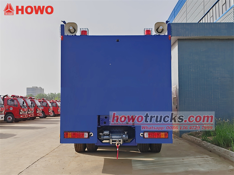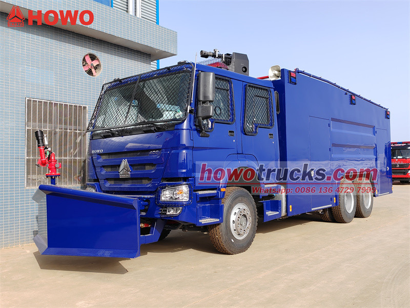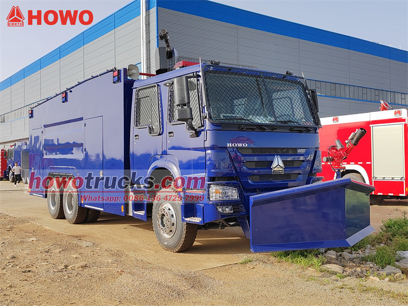 HOWO 6x4 explosionssäkra vattenkanonlastbil är modifierad baserat på HOWO HW76 dubbelradig hyttchassi. Den har en hjulbas på 4600+1350 mm, är utrustad med en WP12S400E201-motor och en HW19710-växellåda. Fordonet är utrustat med en explosionssäker lådkaross, en huvudkanon på toppen och en frontfyrande fast vattenhjälpkanon på framsidan, vilket kan uppnå allround, storflödes- och långdistansupploppsbekämpning. Den har en dubbelradig hytt och en besättning på 6 personer. Vattentankbilen är på 10 000 liter, skumtankbilen är på 100 liter, färgtankbilen är på 100 liter och pepparvattentanken är på 100 liter. Den är utrustad med en CB10/60 brandpump. Fordonets front är utrustad med upploppsskyddande stålplattor och en kraftfull hydraulisk stålspade för hinderröjning.