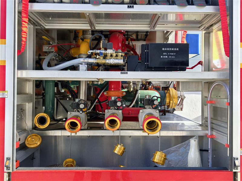 Den tunga brandbilen Howo 4x2 CAFS, byggd på det högkvalitativa Howo C5H-chassit, kombinerar överlägsen kraft med miljövänliga utsläpp och kan hantera en mängd olika utmanande terränger. Den integrerar en vattenpump, ett skumdoseringssystem och ett luftkompressionssystem, som släcker bränder genom att spruta tryckluftsskum. Den har också ett oberoende kraftgenereringssystem och ett nödbelysningssystem, vilket ger flervinklad belysning runtomkring för att snabbt belysa räddningsvägar under en brand. Kontrollpanelen är språkinställbar och erbjuder olika valfria konfigurationer för att möta olika behov.