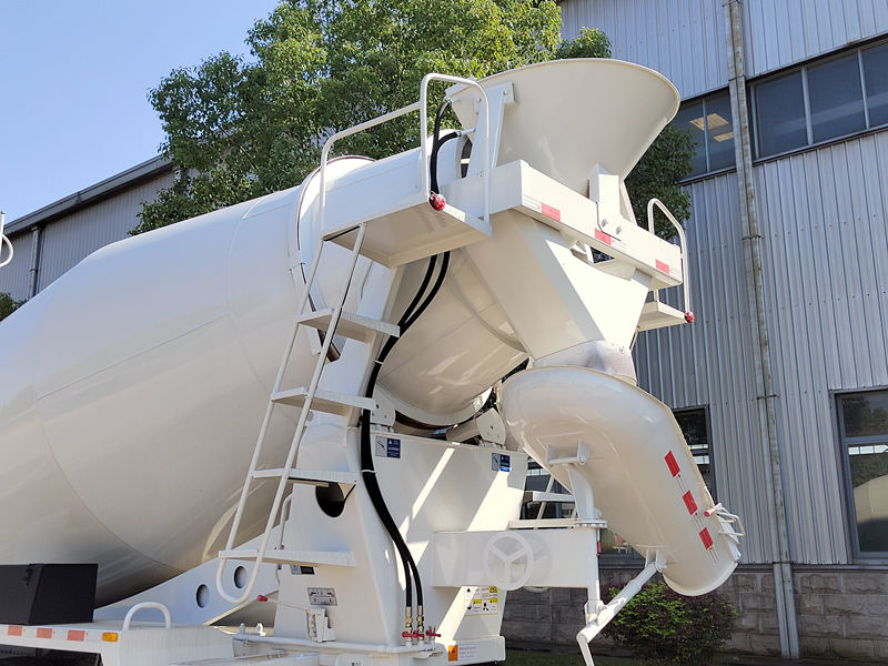 3. Blandningstank: Blandningstrumman är en nyckelkomponent i hela betongbilen. Den fungerar som behållare för betongförvaring och spelar en avgörande roll för att förhindra att betongen stelnar och segregerar. Bladen i tanken tjänar främst till att röra om och styra betongen.