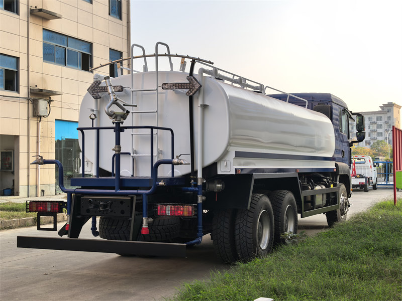 stainless steel tank, 6×6, RHD is optionalHOWO TX 18000L vattenspridningsbil är ett högkapacitetsfordon med multifunktionella funktioner, byggt på HOWO TX:s kraftiga chassi, med en vattentankvolym på 18 000 liter. Den drivs av en Weichai-dieselmotor på 380 hästkrafter och en 10-växlad manuell växellåda, vilket ger robust prestanda och hög bärförmåga. Tanken är konstruerad av 5 mm kolstål och belagd med ett korrosionsskyddande lager, medan dess interna struktur inkluderar fyra fack och överspänningsskyddande bafflar för att förbättra körstabiliteten. Fordonet integrerar ett Weilong-centrifugalpumpsystem, som stöder självsugande dränering och drift med ett flöde på 60 m³/h. Den har också ett flerlägessprutningssystem, inklusive spolning fram, spolning bak, sidosprutning och en högtrycksvattenkanon med en räckvidd på 28 meter, vilket gör den lämplig för olika tillämpningar som stadsgröning, dammdämpning, kylning och brandbekämpning.