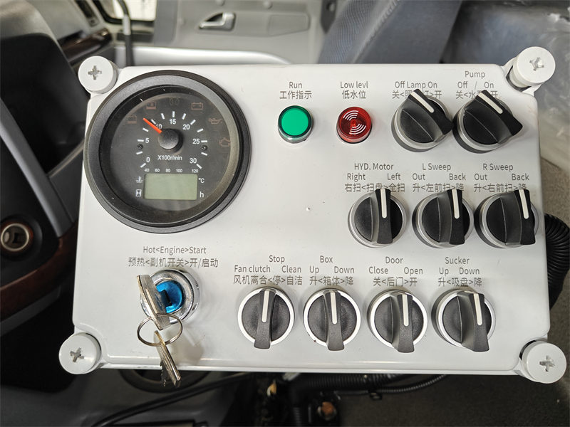 HOWO 12cbm sopmaskin är modifierad baserat på HOWO HW76 hyttchassi. Den har en hjulbas på 4600 mm och är utrustad med en Weichai WP10.300E22-motor, en Sinotruk HW19710-växellåda, en 4000L vattentank i kolstål, en 8000L inre och yttre soptunnor i kolstål i rostfritt stål och en Dongfeng Cummins B140 33 hjälpmotor. Fordonet är utrustat med fyra sopborstar och en sugkopp, en Weiye-fläkt, en tysk PINFL PF36 högtryckskolvpump (1150 r/min) och en Hangzhou Weilong 60/90 lågtrycksvattenpump (60m³/h). Det finns flera spolmunstycken framför hytten och ett sprutmunstycke framför sopborsten. Högtrycksvattenspolbredden är 2,5 m, sopborstens sopbredd är 3,5 m och den maximala sopkapaciteten är 60 000 m³/h. Sophastigheten är 3-20 km/h. Fordonet styrs av en elektronisk kontrollbox i hytten och en manöverbox vid sugarmen.